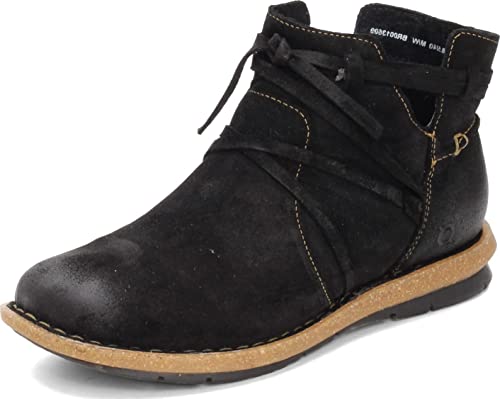 Women’s Born, Tarkiln Ankle Boot. Bring a unique look to any outfit in these short boots. Leather uppers with wraparound leather lace detail Opanka hand crafted construction Zipper closure for easy on and off Leather lined, cushioned footbed for added comfort Lightweight and flexible EVA outsole. Heel Height of 1.00 inches